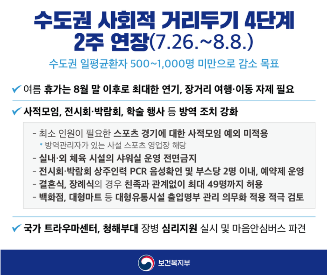 그밖에 4단계 거리두기가 2주간 연장되면서 달라지는 내용들은 아래와 같습니다.
