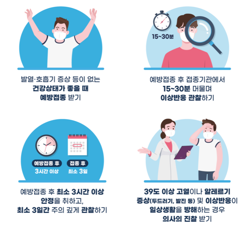 주요 증상으로는 가슴통증, 압박감, 불편감, 호흡곤란, 호흡시 통증, 심장이 빠르게 뛰거나 두근거리는 증상, 실신 등이 있습니다. 접종 후에 이러한 부작용이 나타나는지 잘 살펴보고 증상이 나타난다면 바로 병원을 찾으셔야합니다.