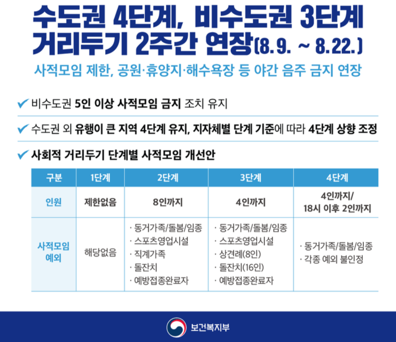 ✔️수도권 4단계, 비수도권 3단계 2주 연장(8. 9 ~ 8. 22)