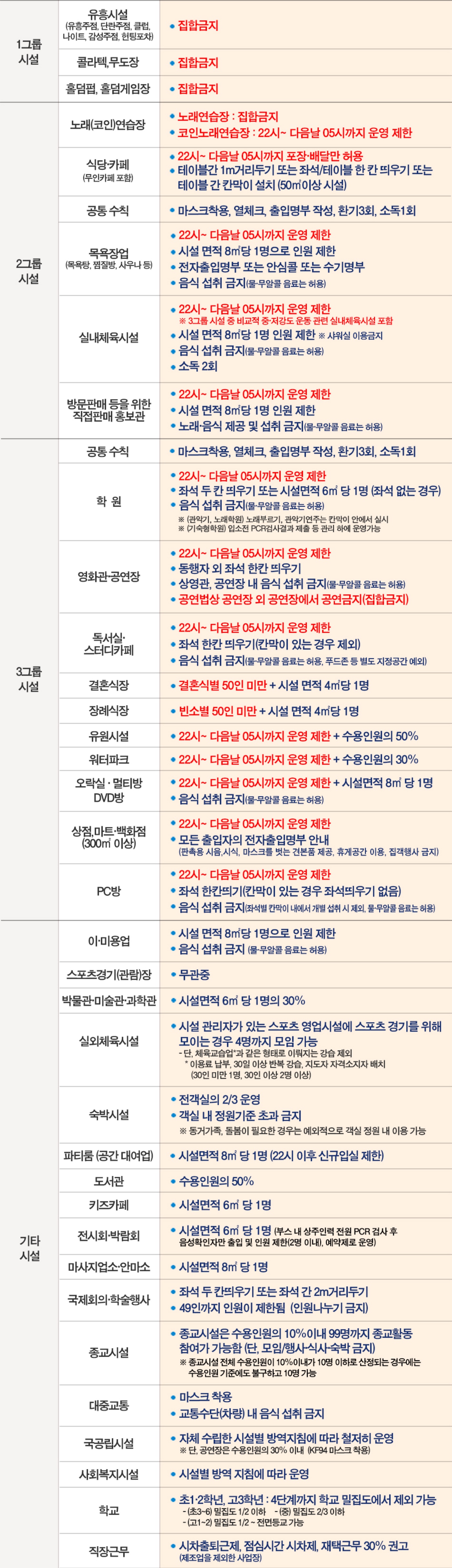 대부분의 다중이용시설은 22시부터 다음날 05시 가지 운영을 제한합니다.