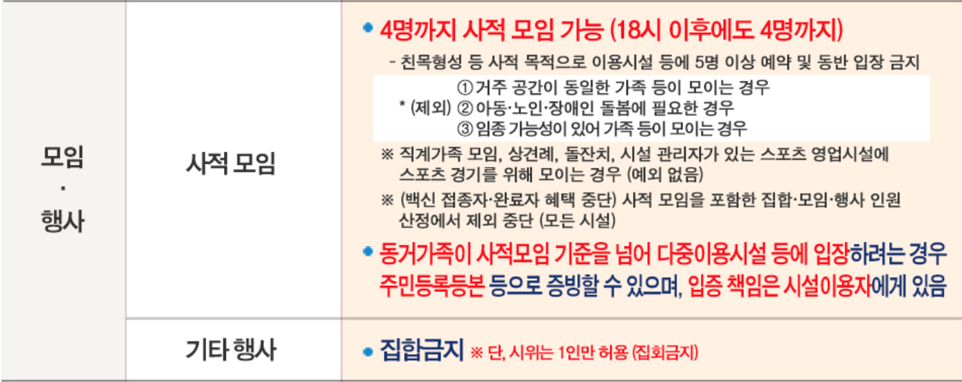 📌사적모임제한 예외 : 동거가족 / 아동·노인·장애인 돌봄에 필요한 경우 / 임종가능성이 있어 가족이 모이는 경우