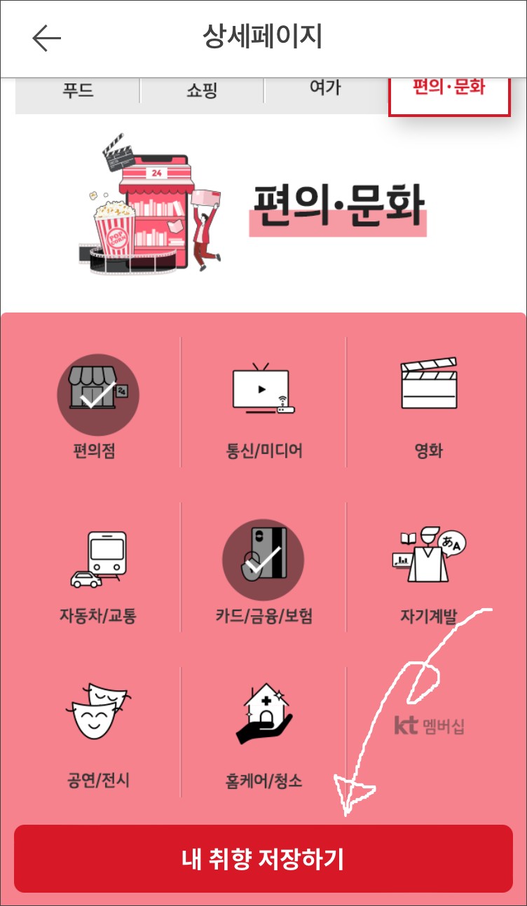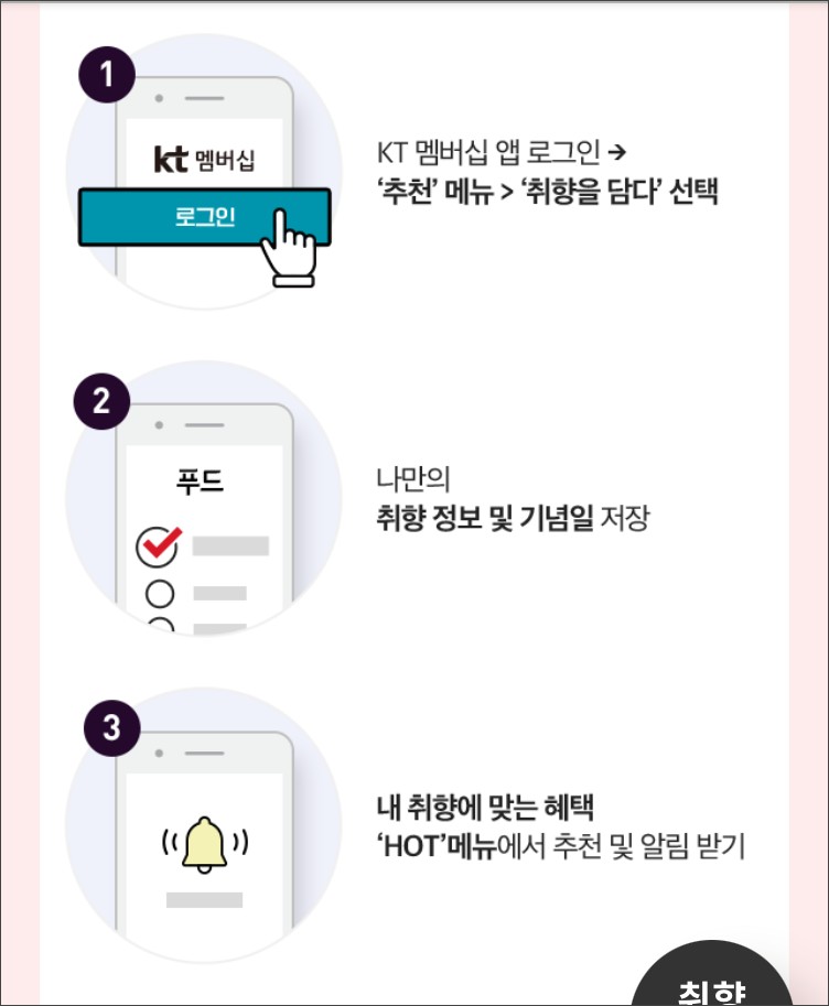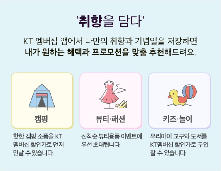 케이티멤버십 앱에서 나만의 취향과 기념일을 저장하면 내가 원하는 혜택과 프로모션을 맞춤 추천해준다고합니다.