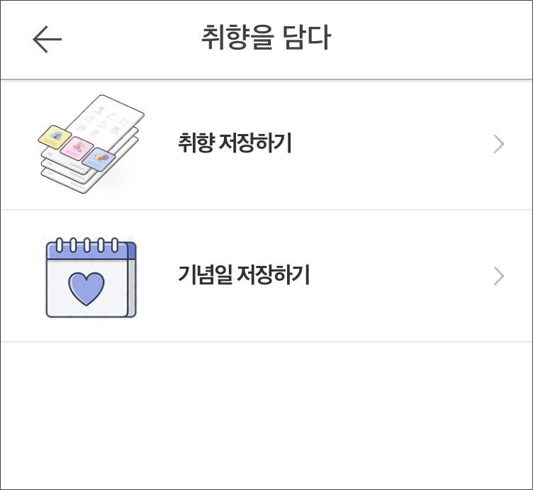 취향을 담다 페이지로 들어가면~ 두개의 메뉴로 구성되어 있습니다.