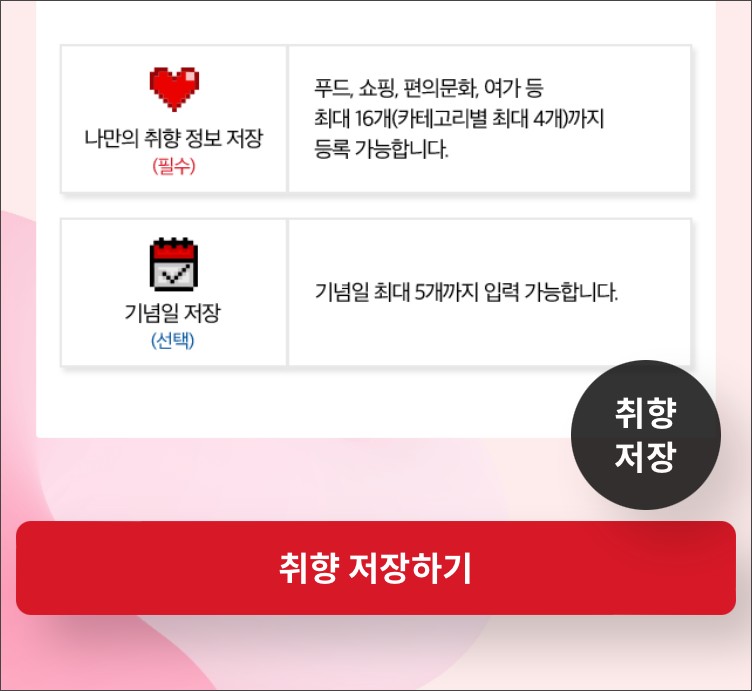 까만색 동그란 취향저장이란 버튼이나, 하단의 빨간 박스 취향저장하기를 클릭하여