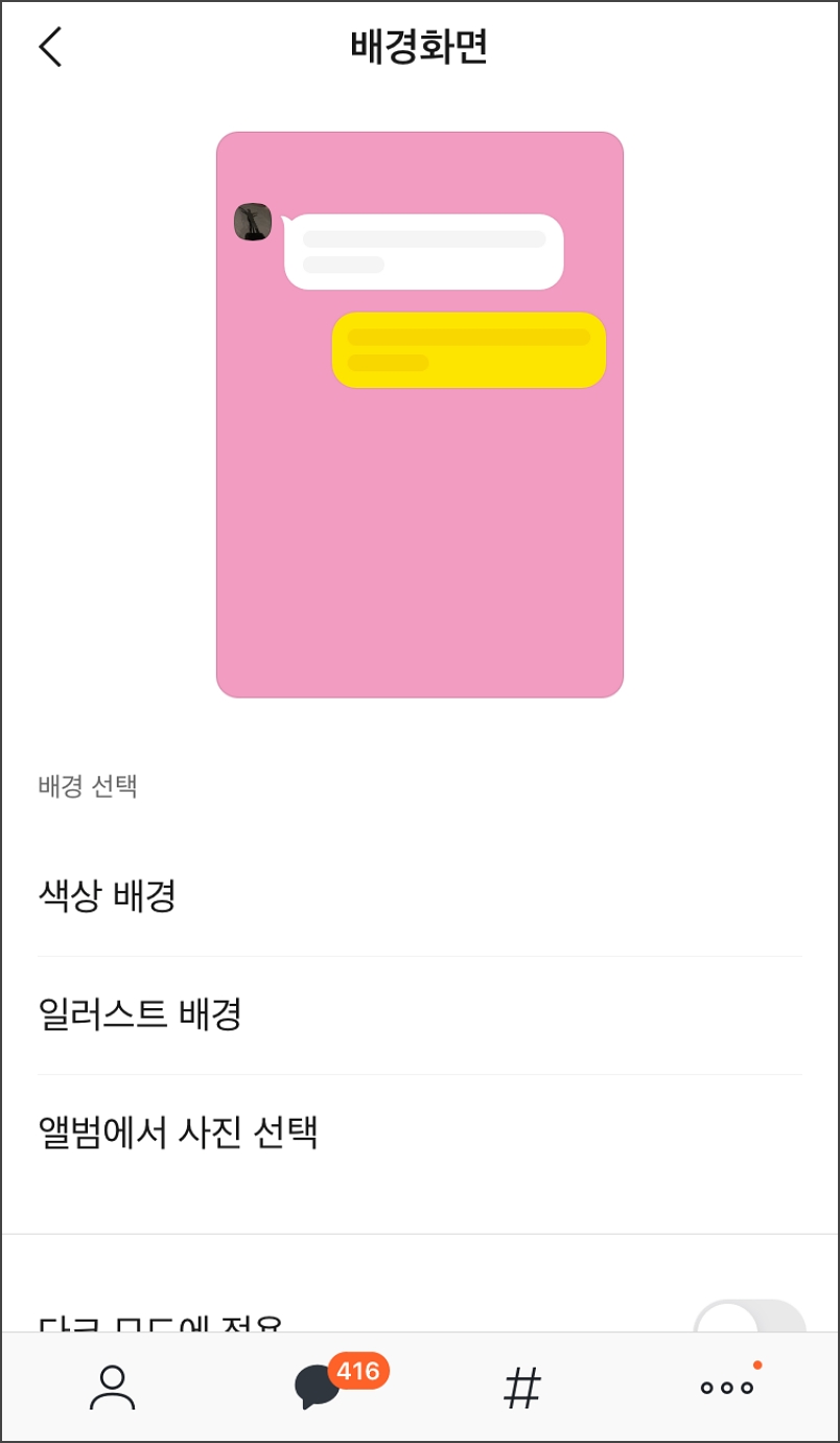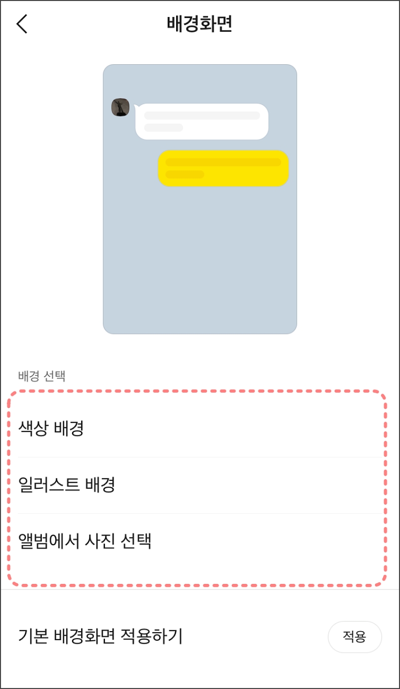 5. 채팅방 배경 선택에는 세가지가 있습니다. 색상배경 / 일러스트 배경 / 앨범에서 사진 선택!